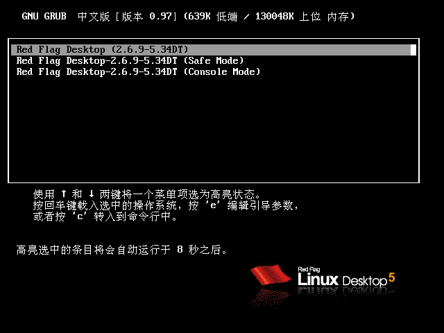 如不进行选择,10秒后将自动启动默认选项。红旗Linux5.0桌面正式版启动过程出现如下图27所示。