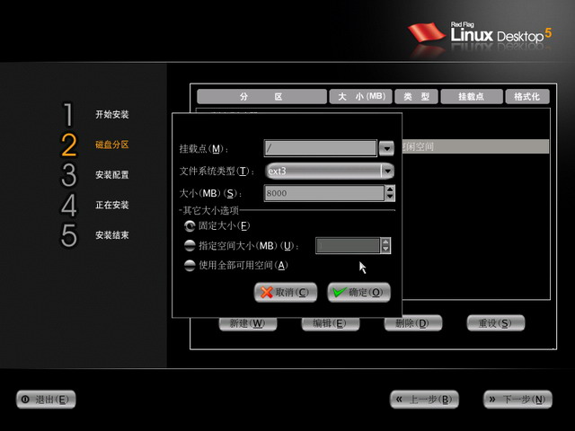 在弹出的窗口中挂载点一栏选择“/”,文件系统类型选“ext3”,大小为“8000”如下图6所示。
